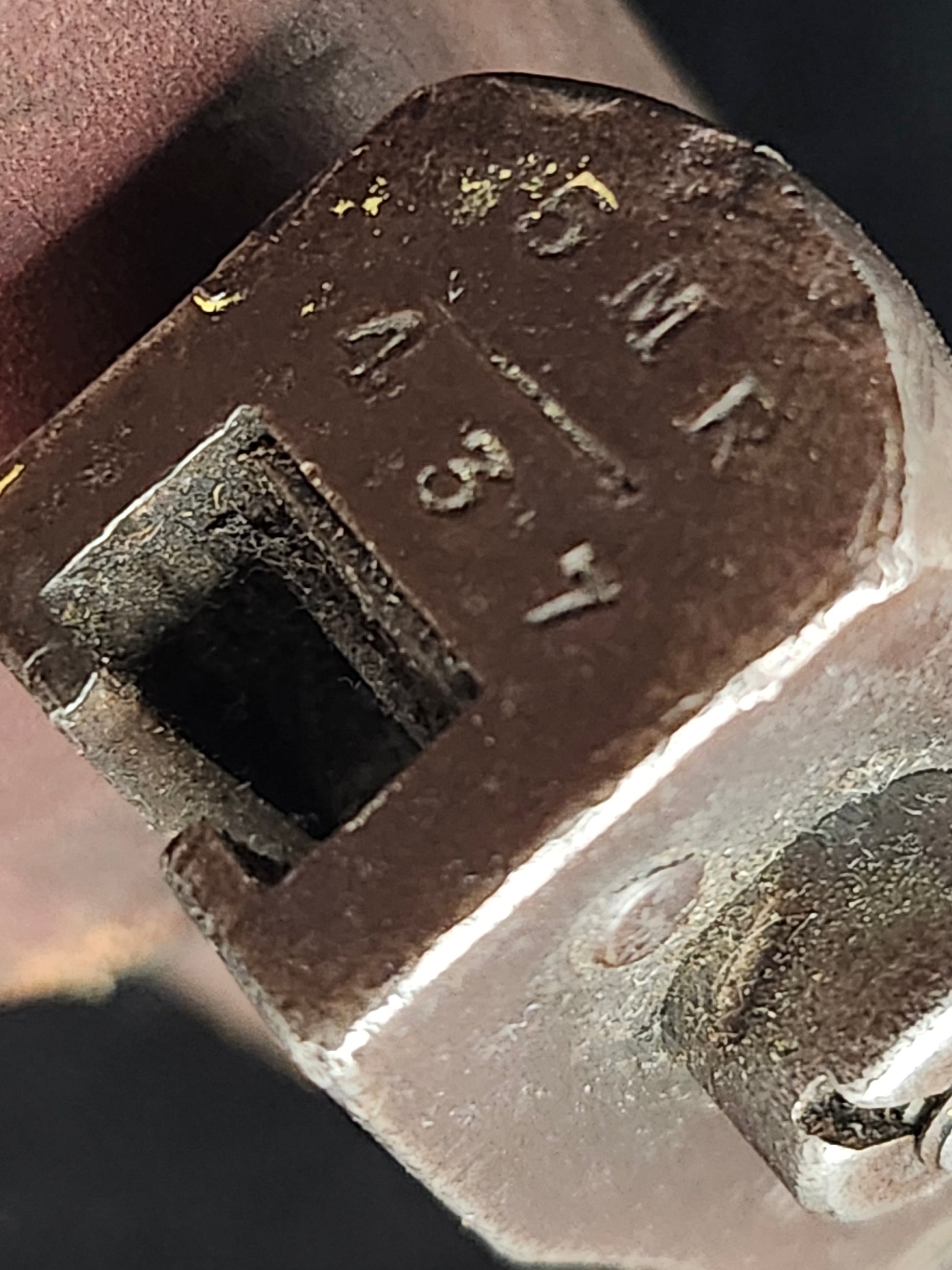MK.1 Ross Bayonet dated Aug. 1910. Blade has patina with sharpening and the blunt tip is mildly damaged. Back of the pommel is stamped 5MR 437, which indicates the 5th Canadian Mounted Rifles and a rack number of 437. Behind the lug there is another stamping of 217 CC 74. The wooden grip is impressed with 2DD-128. Reverse shows some faded letters and the number 78.