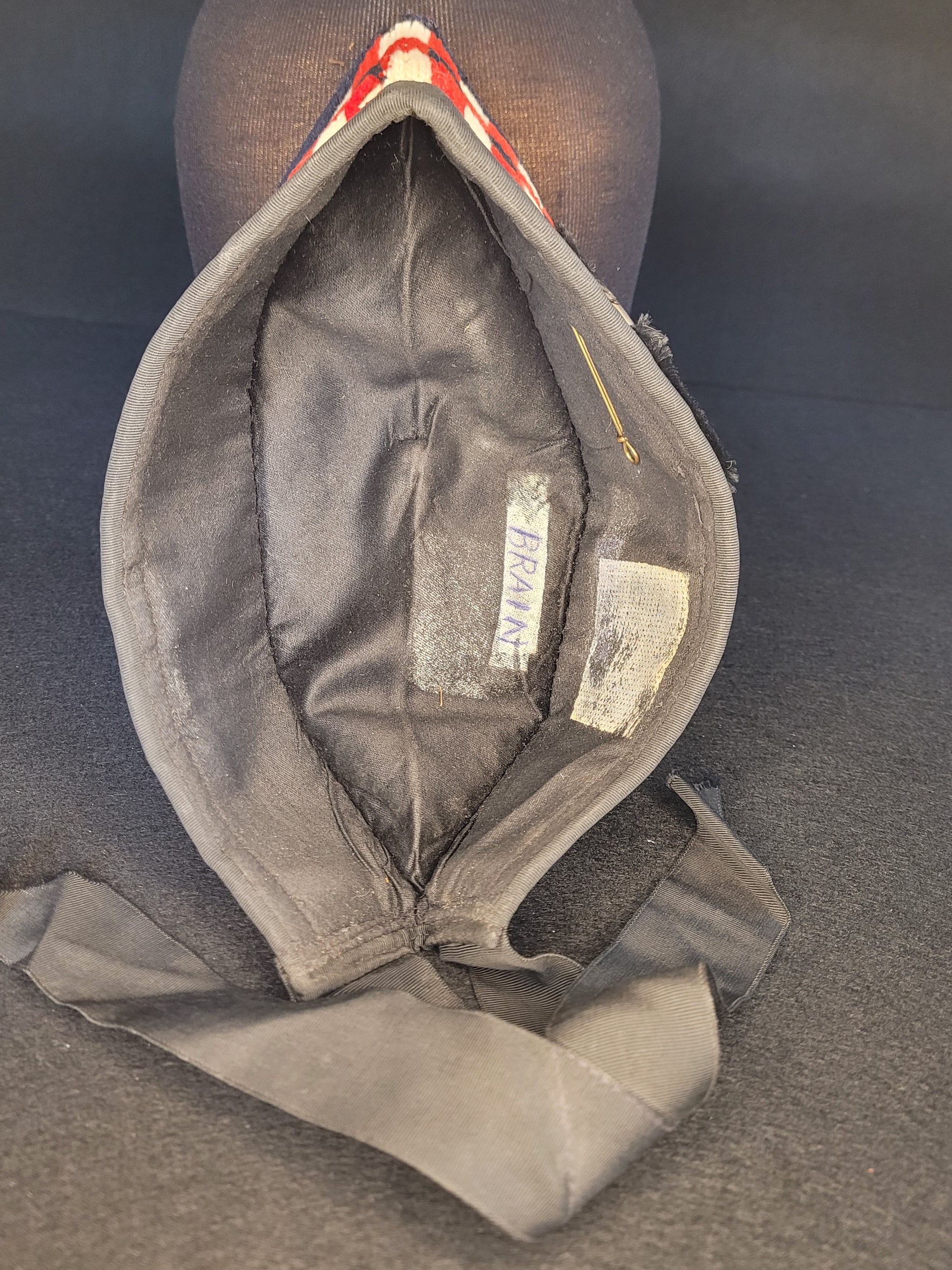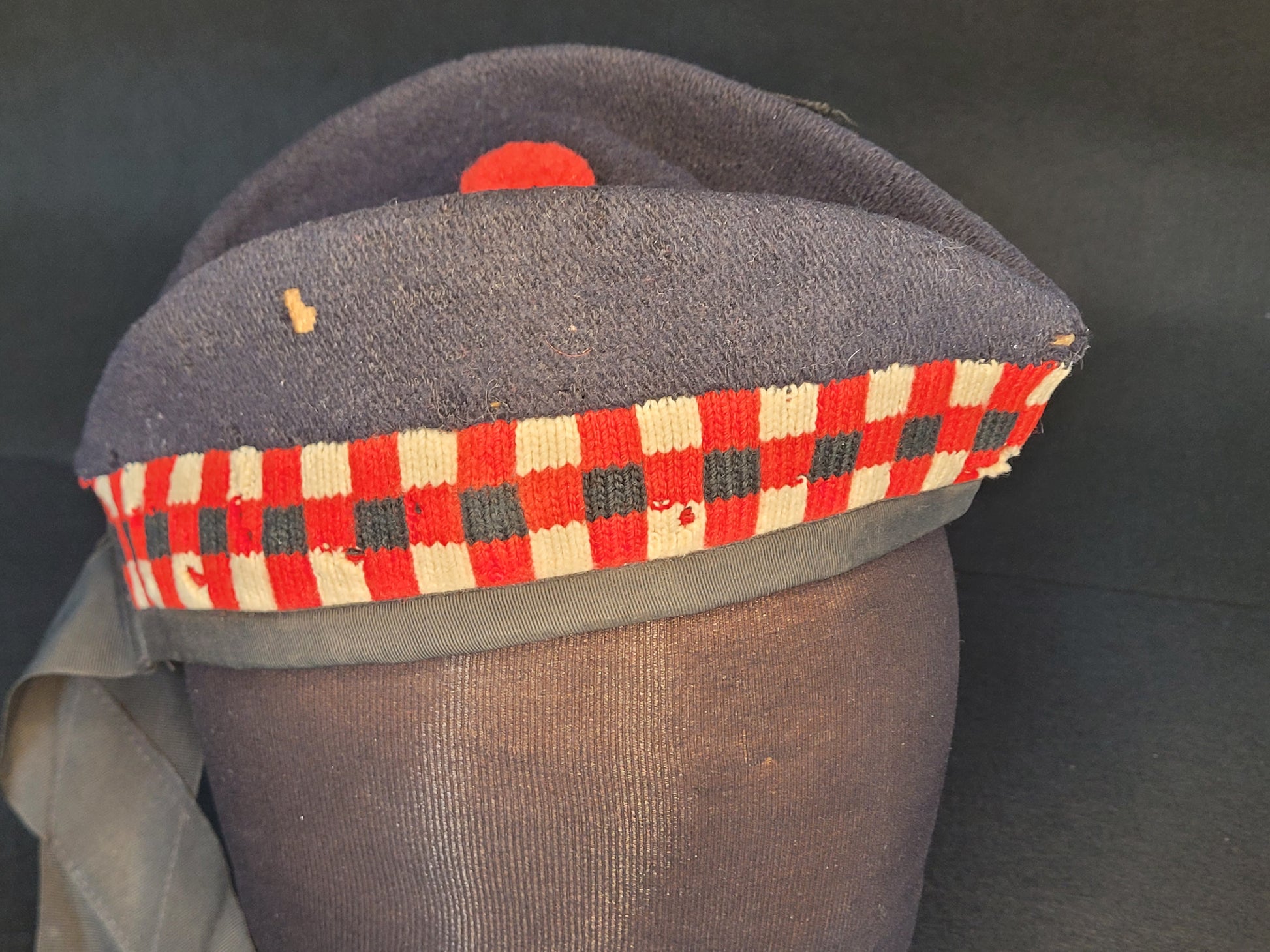Although it's possible this glen is from the era of the second world war, we're inclined to believe it is more likely to be post war. Of the correct dark blue wool with red tourie, 48th's dicing and silk tails with a white metal badge and red backing. It is not maker marked but signed "Brain" inside. A fair bit of mothing as shown in the photos.