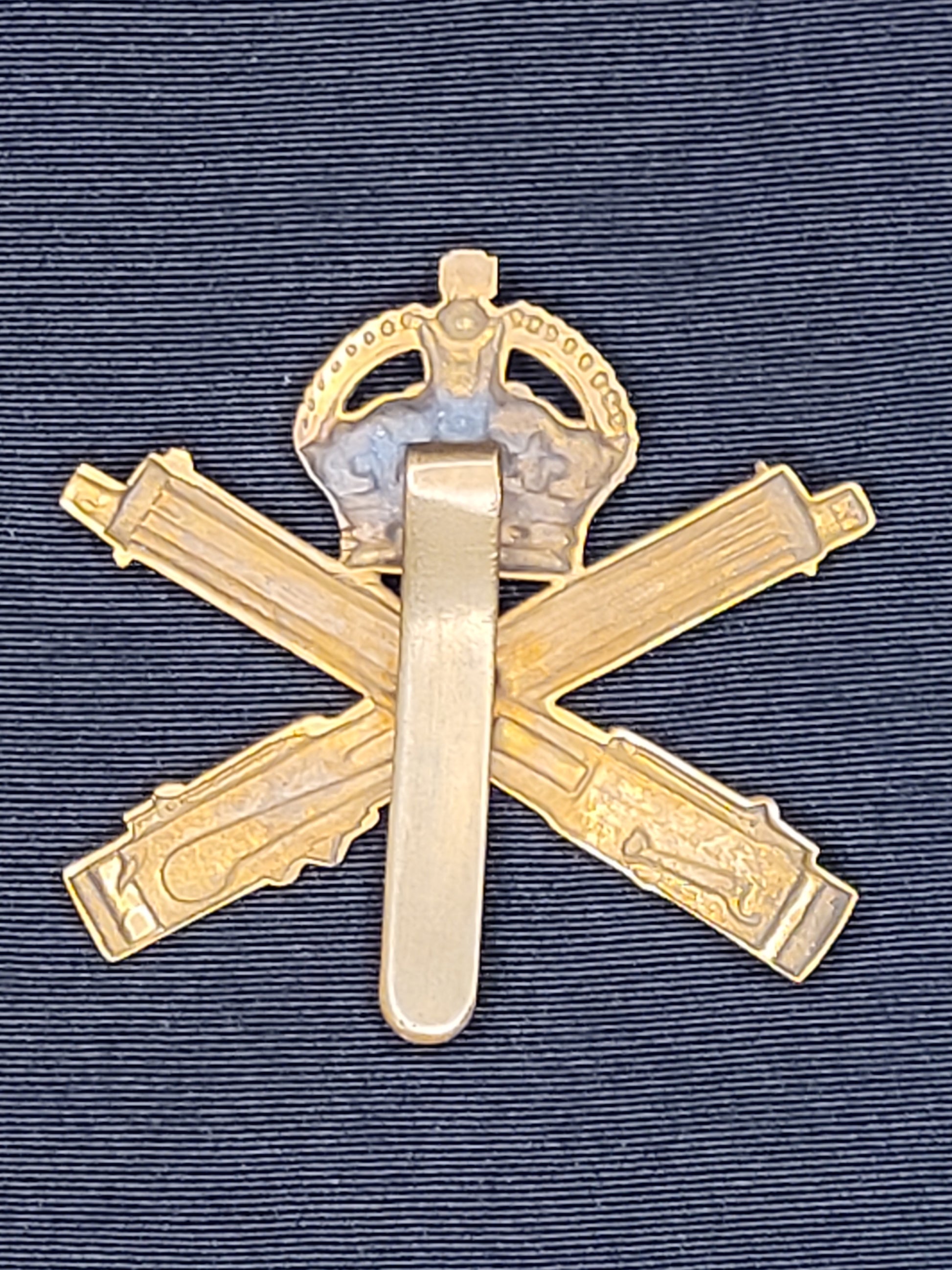 A first world war cap badge in bronze finish to the Machine Gun Corp, Canadian or British use. Original slider attachment, no maker mark. Excellent condition.