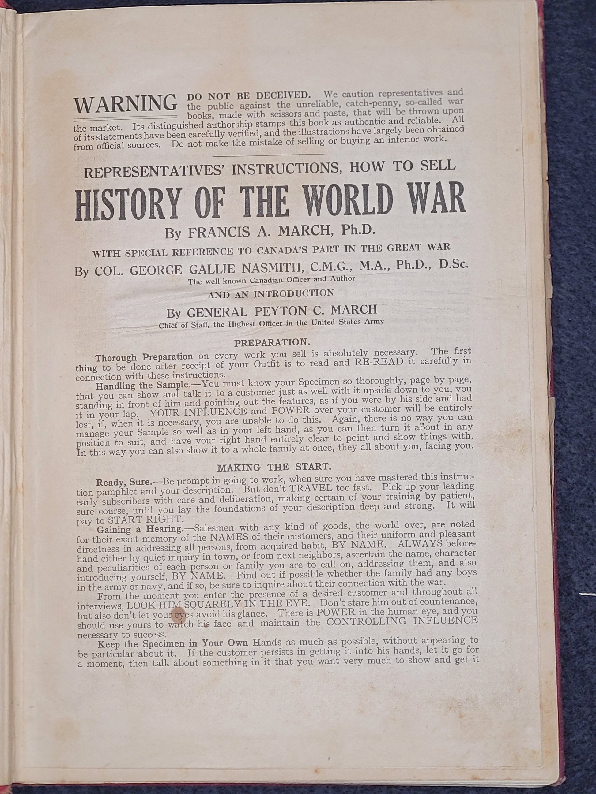 First Edition (1919) by Francis A. March. 800 pages with scores of illustrations and in excellent condition. A comprehensive account of WW1, detailing causes, battles, sacrifices, and geopolitical outcomes using primary sources, official documents, photographs, and maps. As a bonus, included is a copy of the salesman's sample, used for door to door order taking. The sample has abbreviated, summarized chapter information along with illustrations. At the end of the book is a list of customers who bought copies. From the addresses in the list, it seems to have been used in the Niagara region.