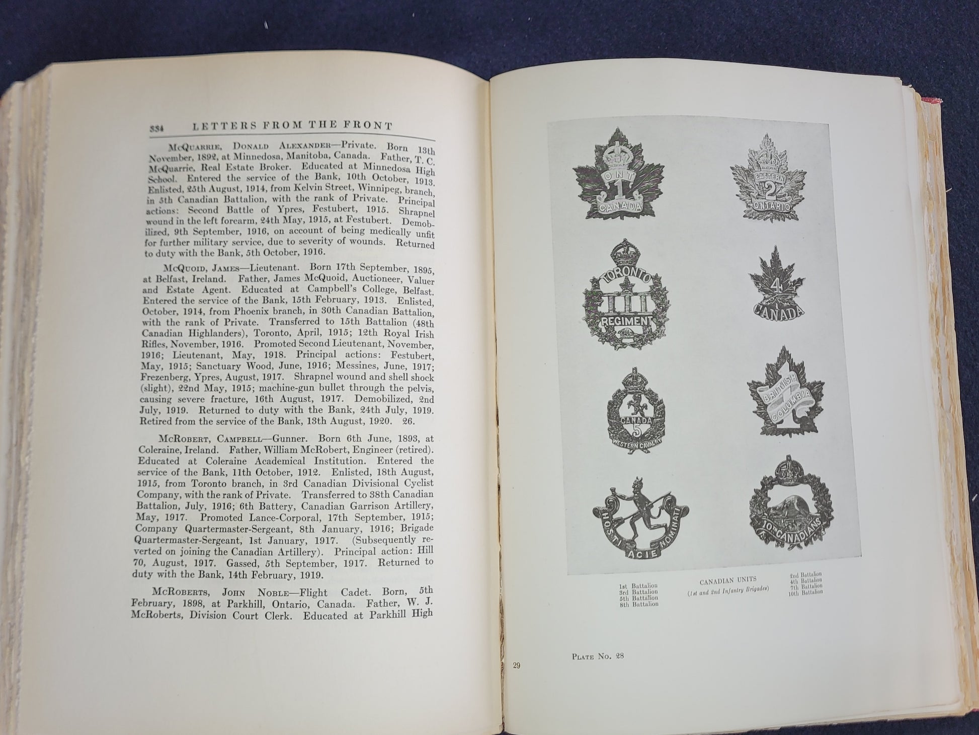 Letters from the Front is a two-volume, hard cover commemorative book published by The Canadian Bank of Commerce (now CIBC) in 1920, documenting the World War 1 experiences of its employees, featuring their letters, biographies, and photos.