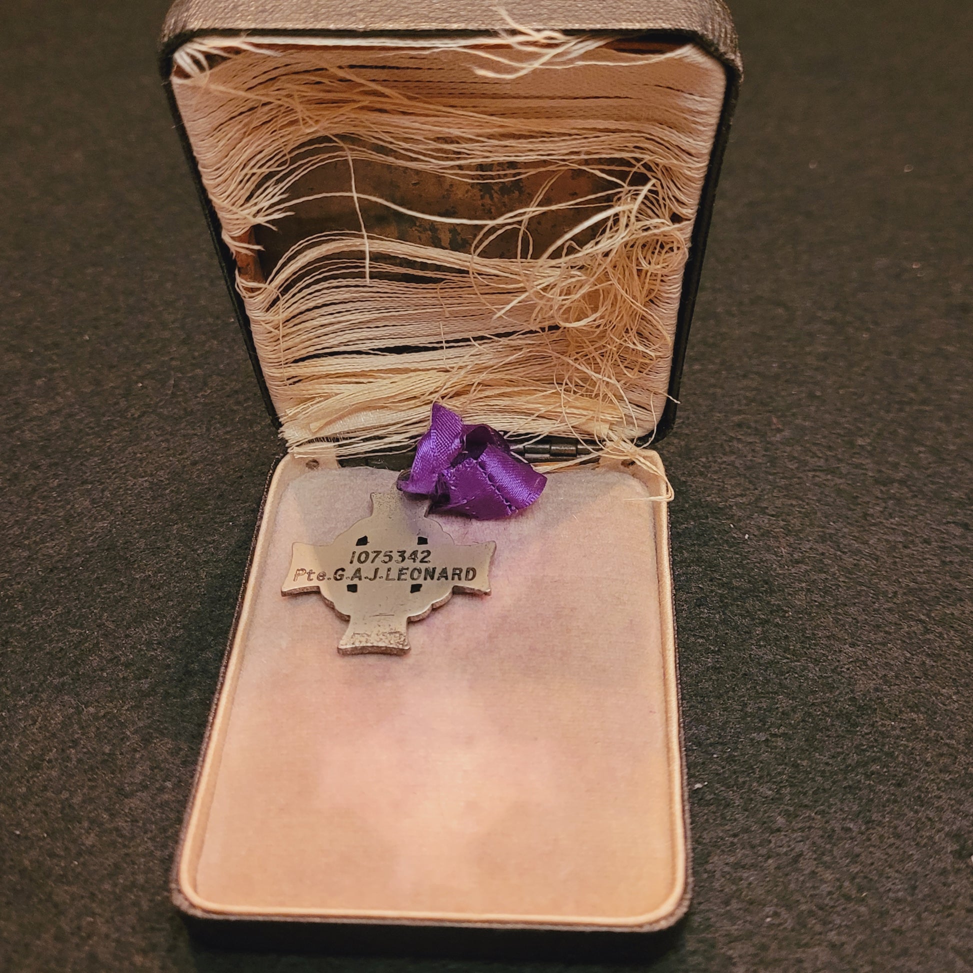 With case of issue. Private George Alfred Joseph Leonard, No. 1075342 was born August 27, 1889 at Quebec City. He attested at Halifax on September 12, 1916. Private Leonard died on August 21, 1917 when he was shot in the head after reaching the objective, Cinnebar Trench, Hill 70. He is remembered on the Vimy memorial as his body was not recovered. Robert Hanna, also of the 29th was awarded the Victoria Cross for actions at this same battle.
