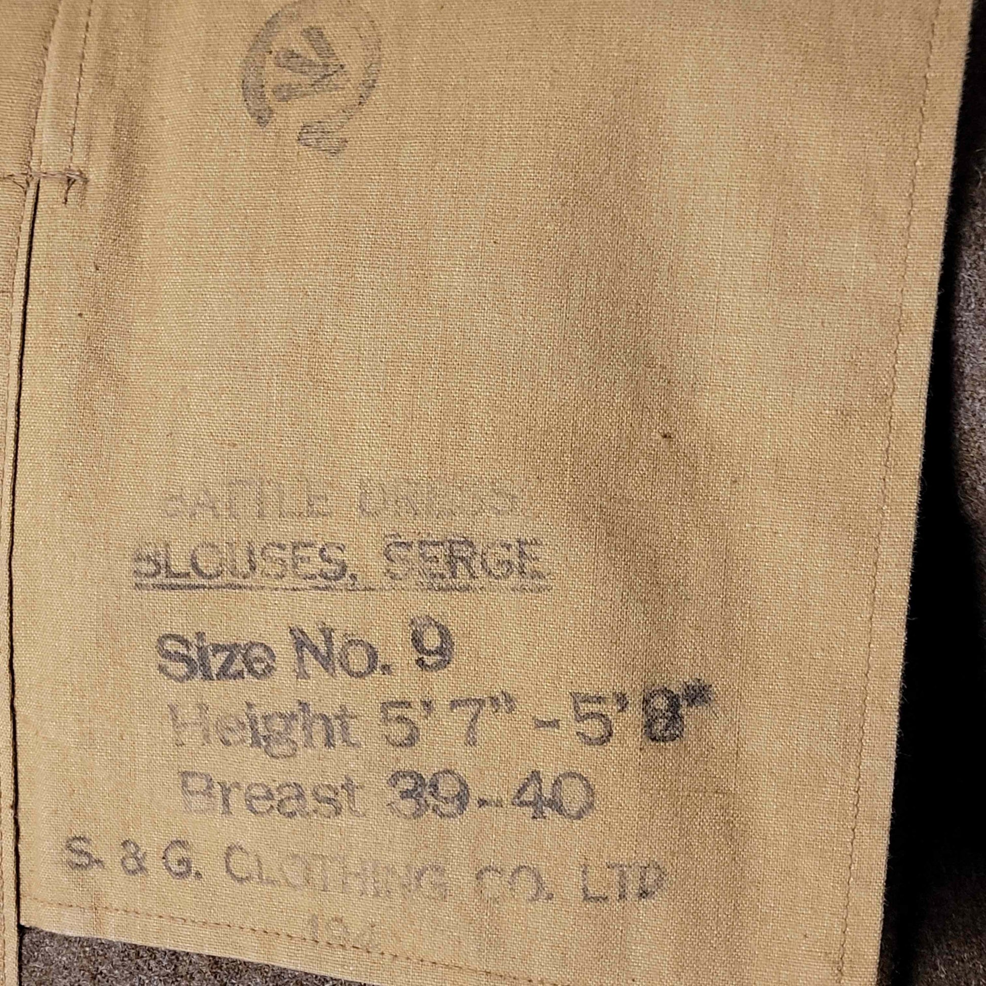 Although the last number in the date is illegible, this is an earlier BD with the hook and eye collar closure and pleated back. Rank badged to a Major in the Royal Canadian Army Medical Corps, suggesting a senior medical officer or doctor that served in England. Four year service chevron including 1939. The battle dress is in excellent condition.